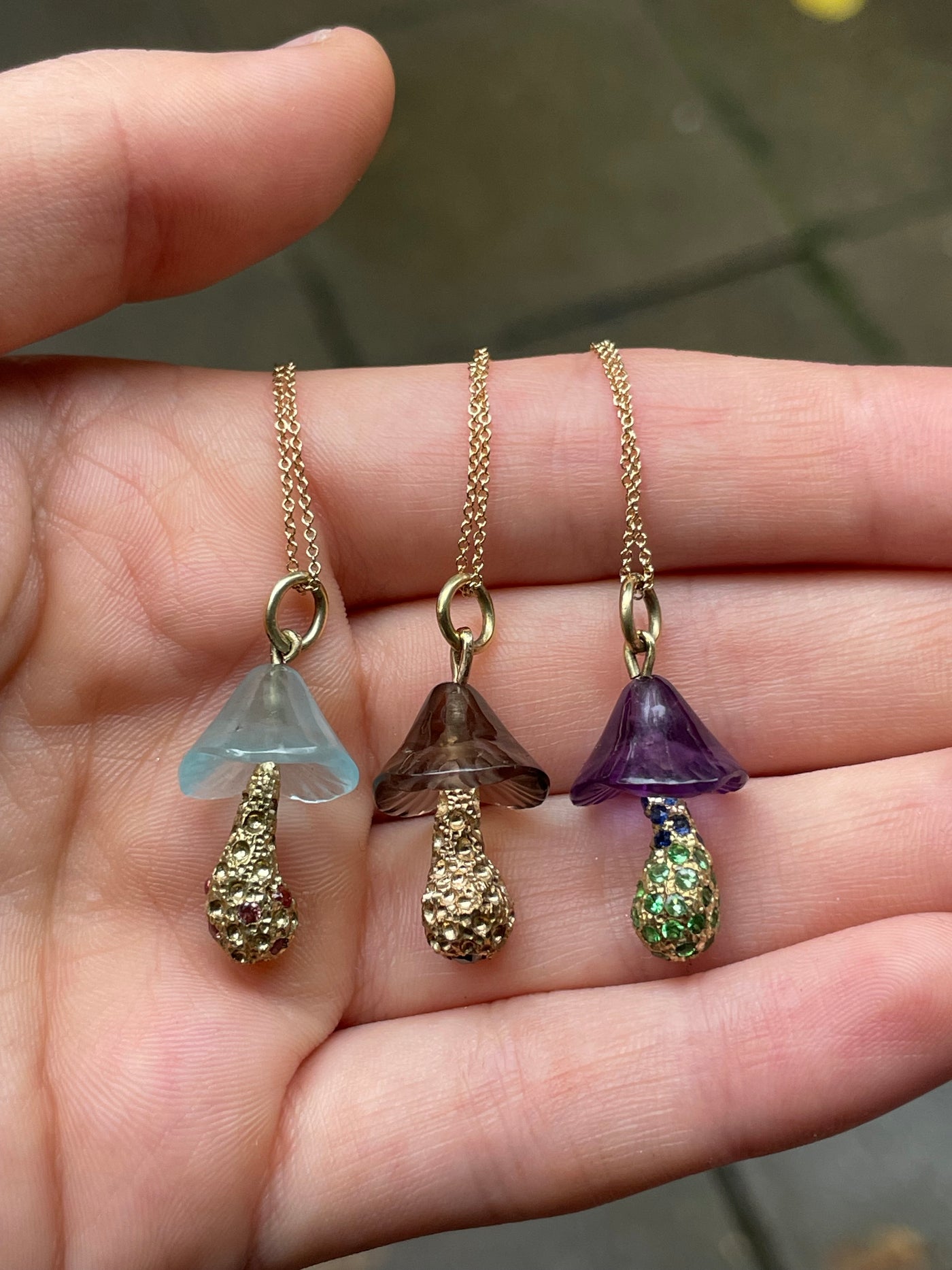 This pendant embodies calm strength and radiant energy. Aquamarine brings clarity and peace, while orange sapphires awaken joy and creativity together forming a small talisman of balance and vitality. Each piece is handcrafted to order within 4–6 weeks. The shroom pendant hangs on 16inch chain.