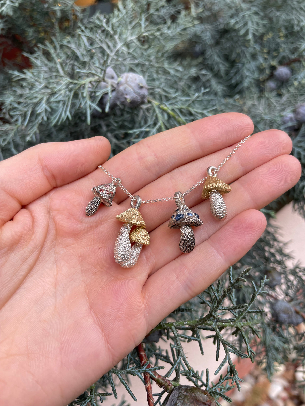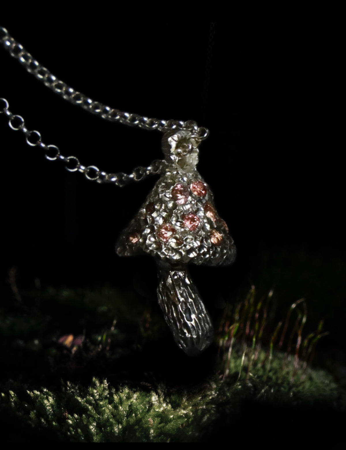 This one-off Orange Cap Shroom pendant, created for the Silver Drop, features a small, intricately crafted silver mushroom set wit orange sapphires. Hanging from an 18-inch chain, with silver oxidized detail.